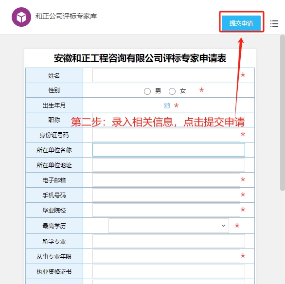 一、入口鏈接:安徽和正工程咨詢有限公司評標專家申請表(點我填寫申請表)二、賬號:評標自薦三、密碼:11223344溫馨提醒:點擊如上入口鏈接,輸入賬號密碼,即可進行填寫申請的界面,默認賬號密碼如上。(也可見如下圖片指引)