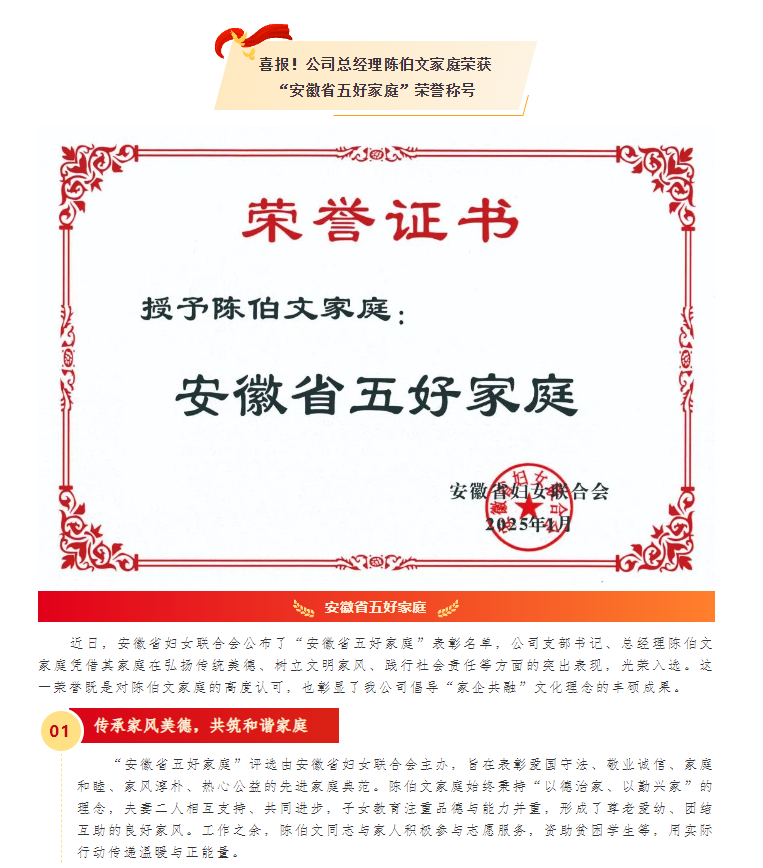 喜報!公司總經(jīng)理陳伯文家庭榮獲“安徽省五好家庭”榮譽稱號